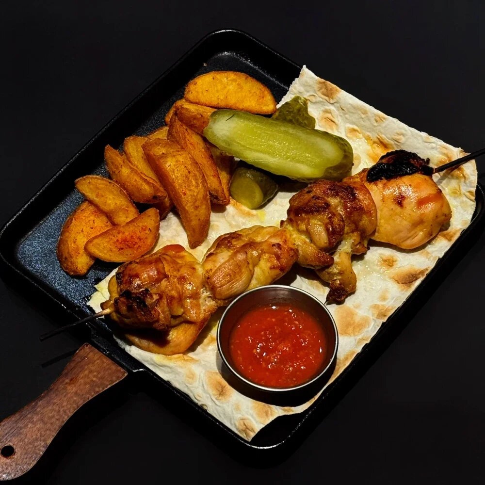 Сочное куриное бедро, замаринованное в специях и обжаренное до золотистой корочки! Мясо сохраняет нежность внутри, а снаружи покрывается ароматной хрустящей кожицей. Подается с лавашем, шашлычным соусом и маринованным огурчиком. Просто, сытно и безумно вкусно!
